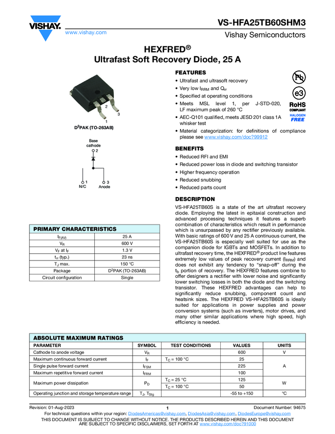 VS-HFA25TB60SHM3 HEXFRED® Ultrafast Soft Recovery Diode, 25 A