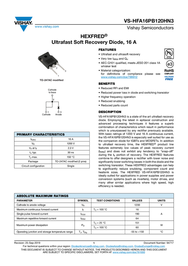 VS-HFA16PB120HN3 HEXFRED® Ultrafast Soft Recovery Diode, 16 A