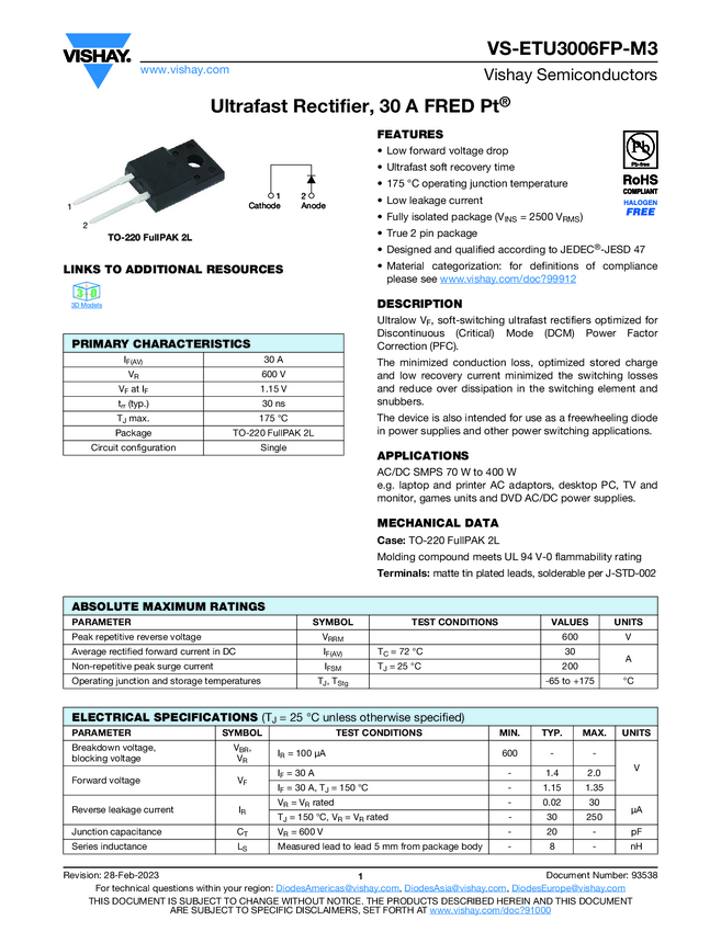 VS-ETU3006FP-M3 Ultrafast Rectifier, 30 A FRED Pt®