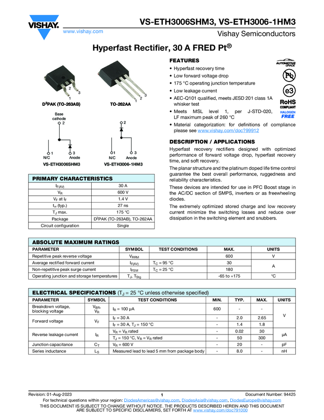 VS-ETH3006SHM3 Hyperfast Rectifier, 30 A FRED Pt®