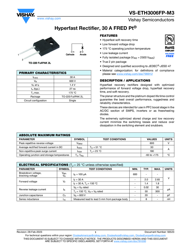 VS-ETH3006FP-M3 Hyperfast Rectifier, 30 A FRED Pt®