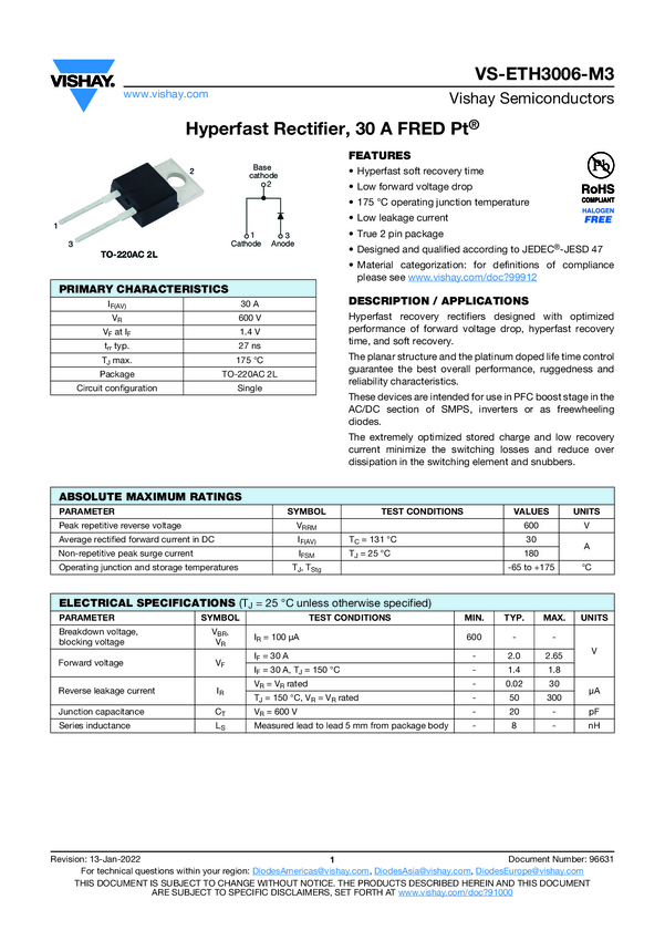VS-ETH3006-M3 Hyperfast Rectifier, 30 A FRED Pt®