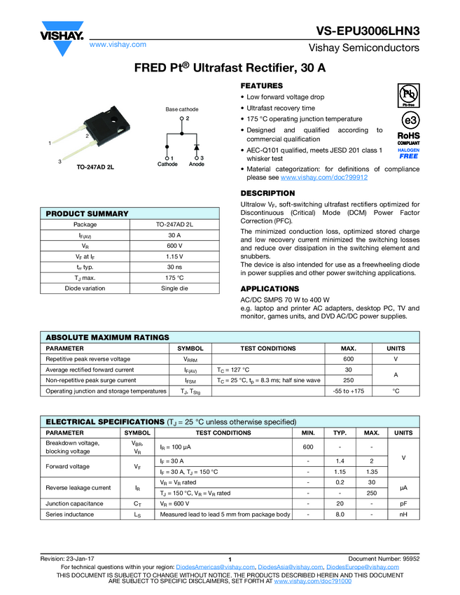 VS-EPU3006LHN3 FRED® Ultrafast Rectifier, 30 A