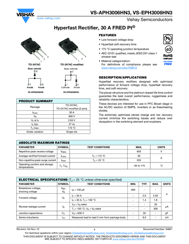 VS-APH3006HN3 Hyperfast Rectifier, 30 A FRED Pt®