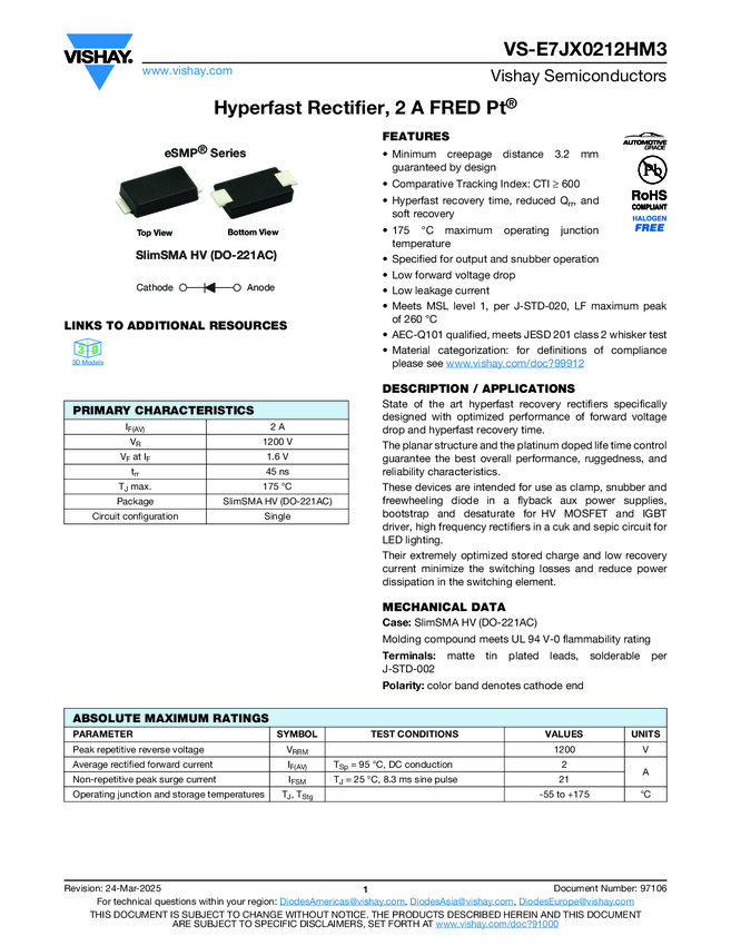 VS-E7JX0212HM3 Hyperfast Rectifier, 2 A FRED Pt®