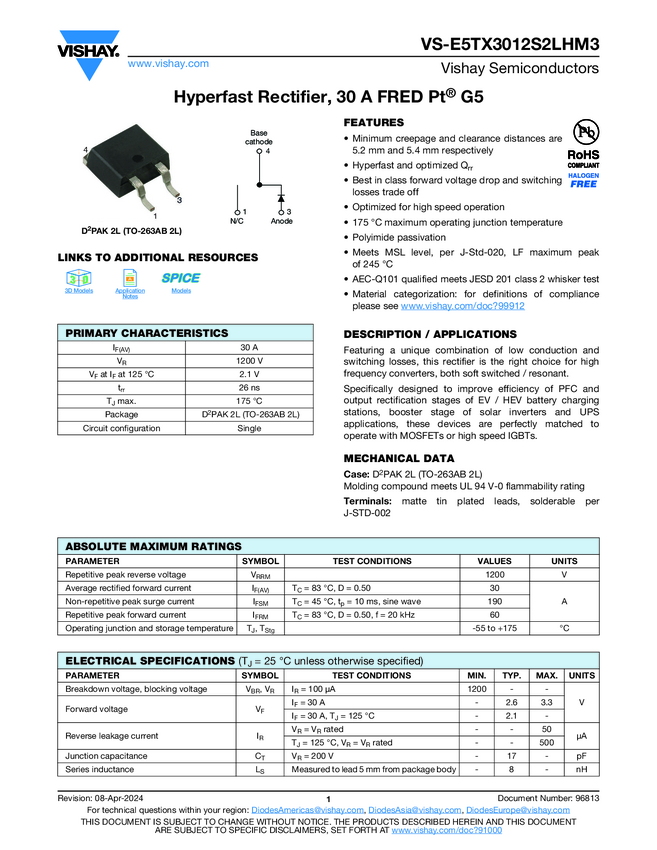 VS-E5TX3012S2LHM3 Hyperfast Rectifier, 30 A FRED Pt® G5