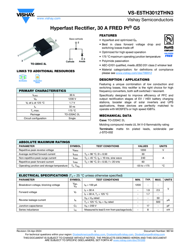 VS-E5TH3012THN3 Hyperfast Rectifier, 30 A FRED Pt® G5