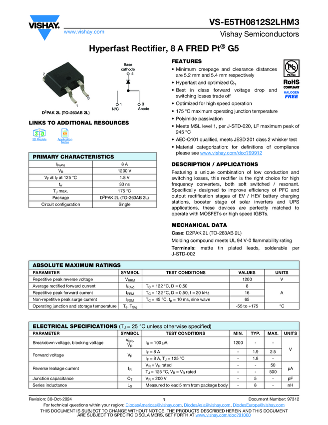 VS-E5TH0812S2LHM3 Hyperfast Rectifier, 8 A FRED Pt® G5