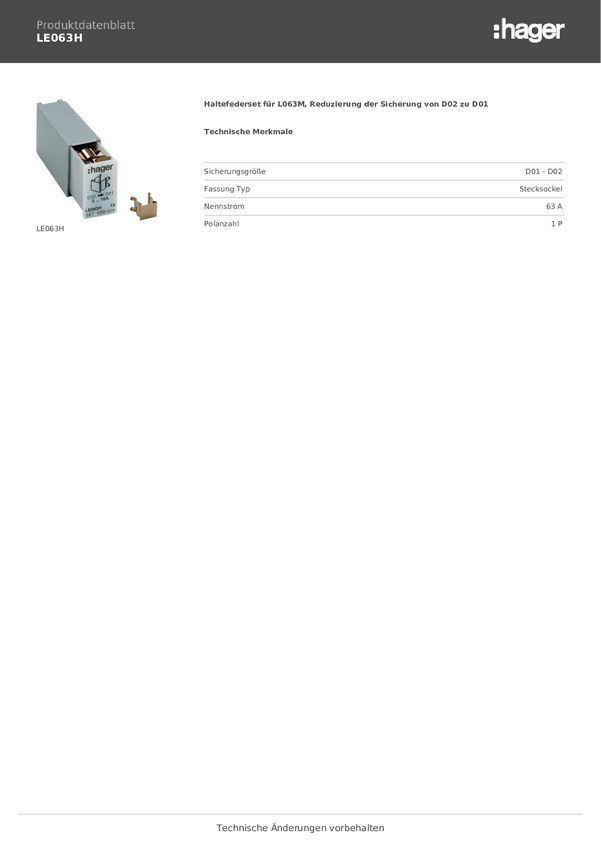 LE063H Hager LE063H sprężyna utrzymująca Rozmiar bezpiecznika = D02 63 A 1 szt.