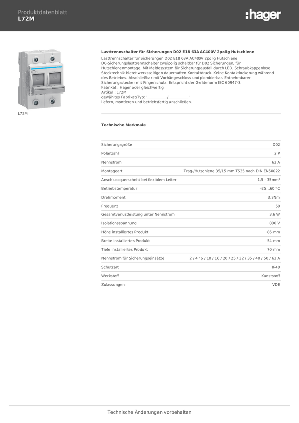Hager L72M Przełącznik rozłączający 2 styki 63 A 1 szt.