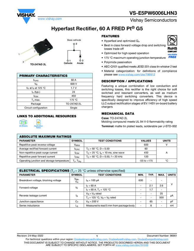 VS-E5PW6006LHN3 Hyperfast Rectifier, 60 A FRED Pt® G5