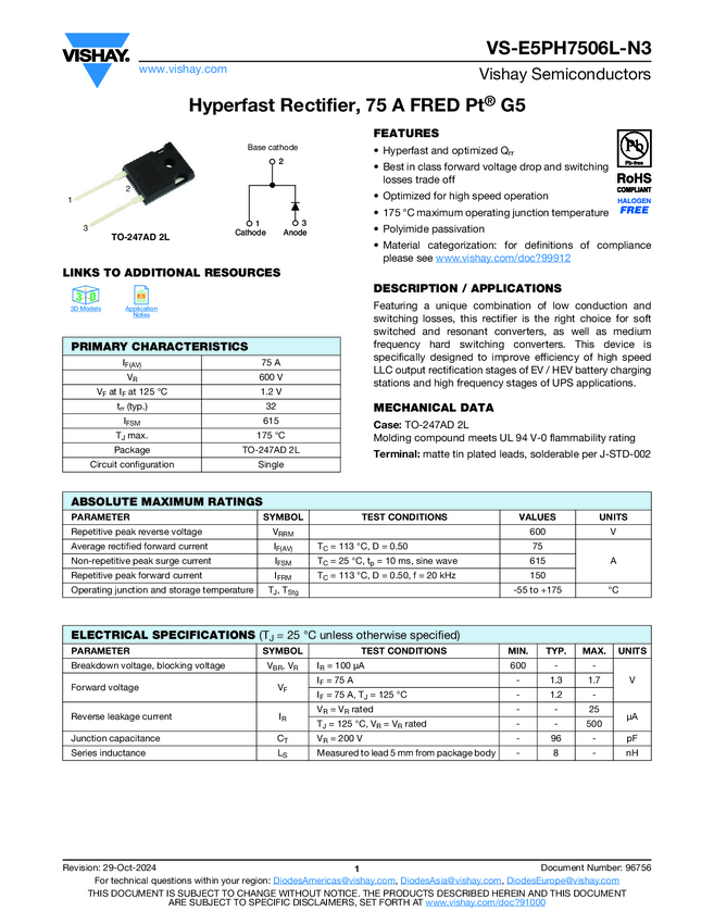VS-E5PH7506L-N3 Hyperfast Rectifier, 75 A FRED Pt® G5