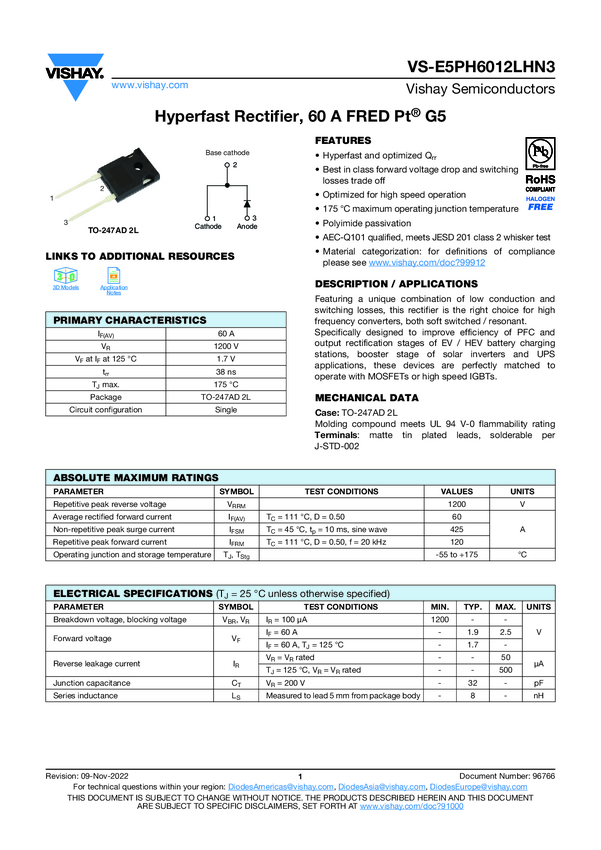 VS-E5PH6012LHN3 Hyperfast Rectifier, 60 A FRED Pt® G5