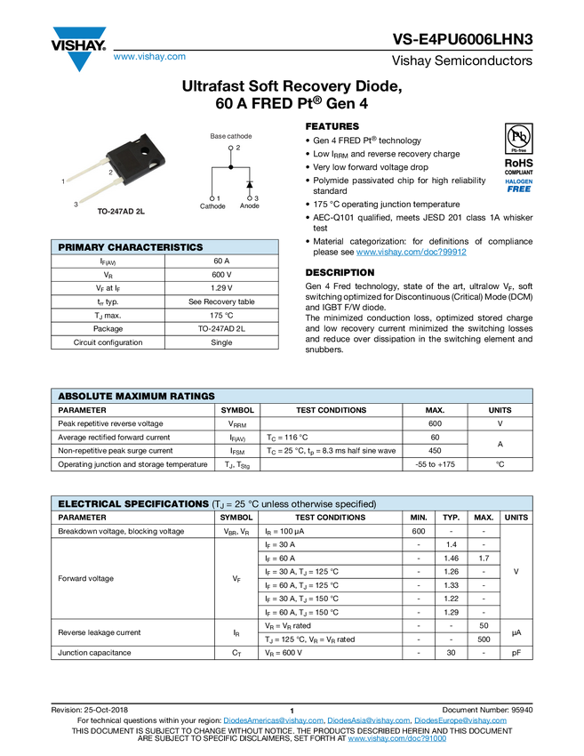 VS-E4PU6006LHN3 Ultrafast Soft Recovery Diode, 60 A FRED Pt® Gen 4