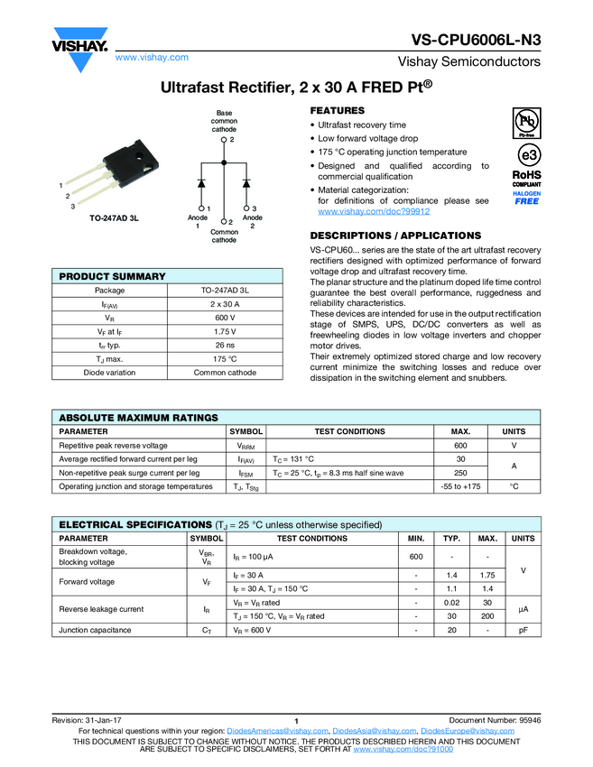 VS-CPU6006L-N3 Ultrafast Rectifier, 2 x 30 A FRED Pt®