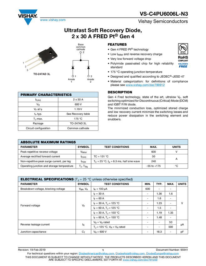 VS-C4PU6006L-N3 Ultrafast Soft Recovery Diode, 2 x 30 A FRED Pt® Gen 4