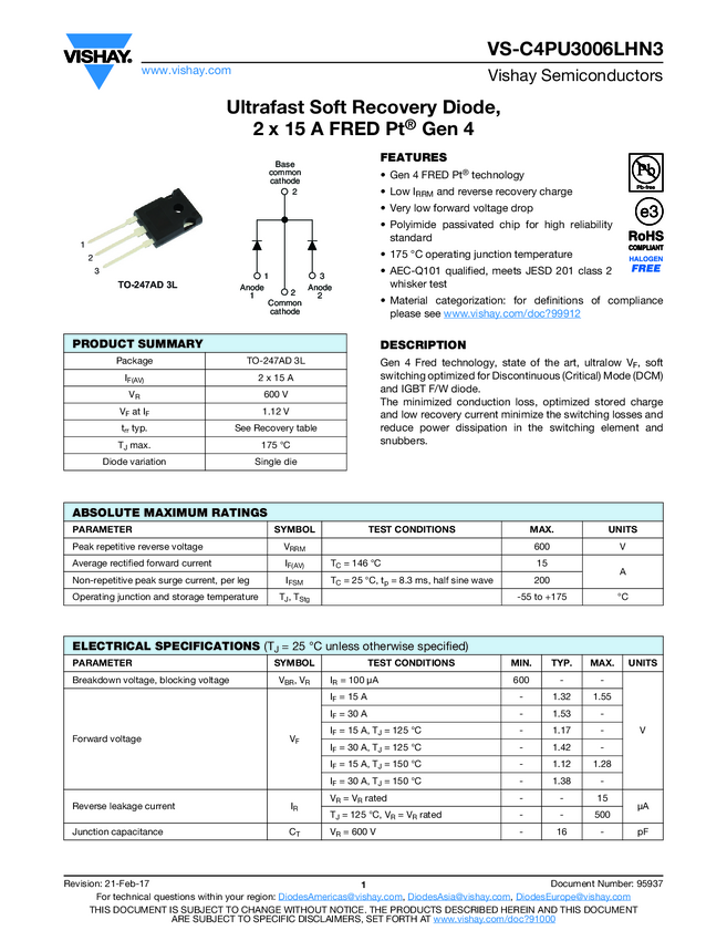 VS-C4PU3006LHN3 Ultrafast Soft Recovery Diode, 2 x 15 A FRED Pt® Gen 4