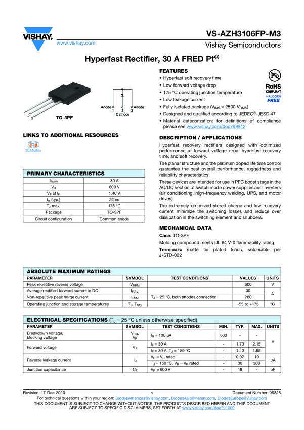 VS-AZH3106FP-M3 Hyperfast Rectifier, 30 A FRED Pt®