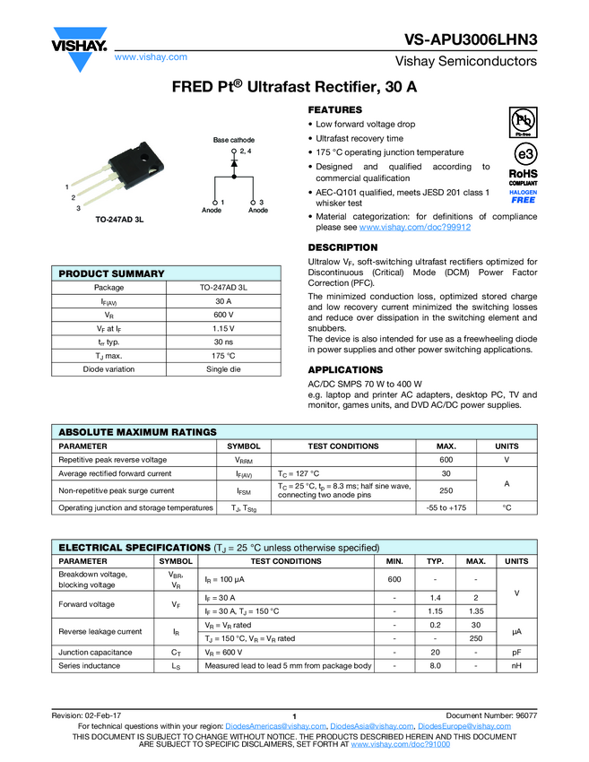 VS-APU3006LHN3 FRED® Ultrafast Rectifier, 30 A
