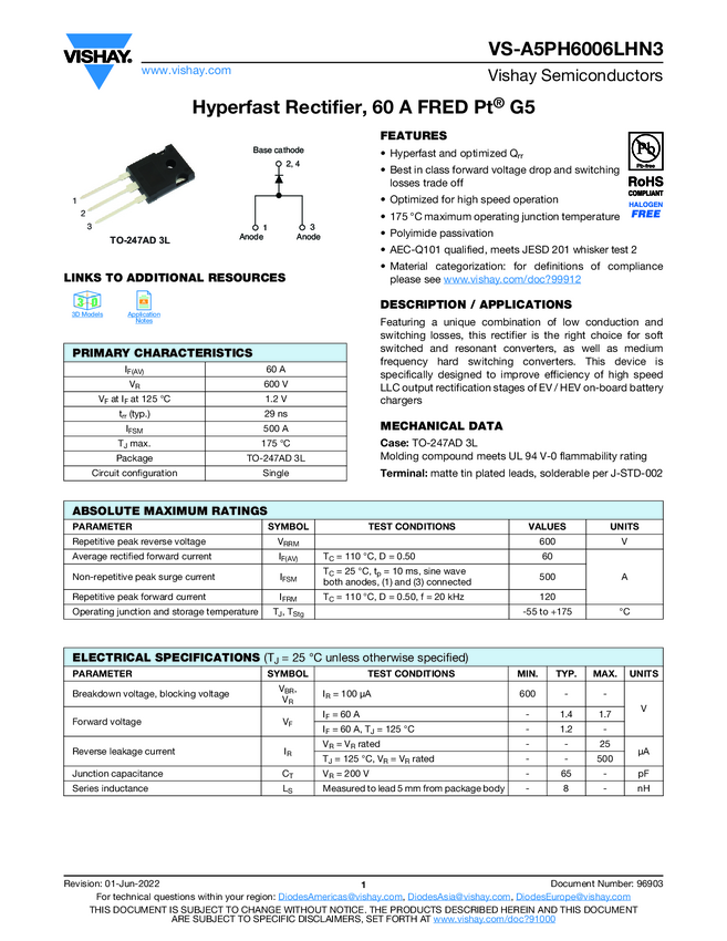 VS-A5PH6006LHN3 Hyperfast Rectifier, 60 A FRED Pt® G5