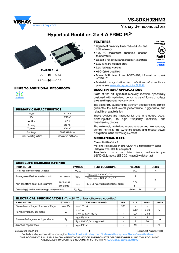 VS-8DKH02HM3 Hyperfast Rectifier, 2 x 4 A FRED Pt®