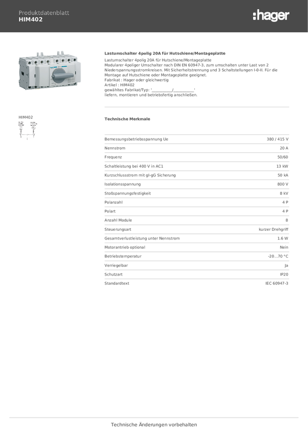 HIM402 Hager HIM402 Przełącznik zasilania 4 styki 20 A 415 V