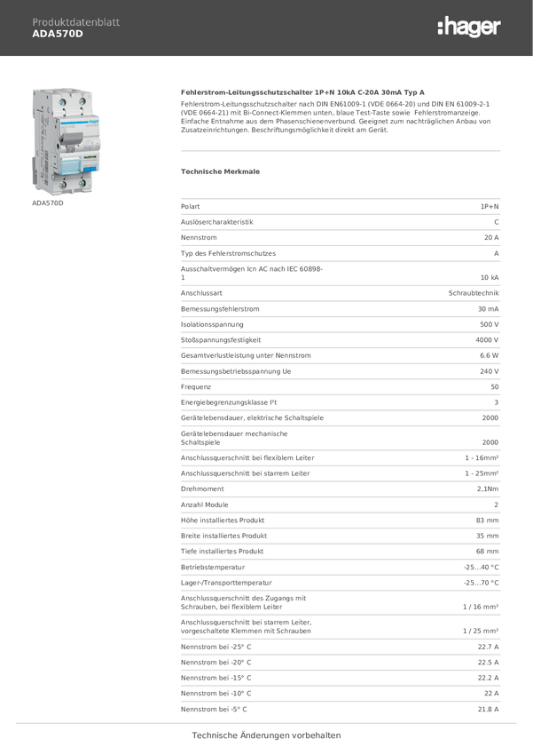 ADA570D Wyłącznik różnicowoprądowy/automatyczny Hager ADA570D 2 styki 20 A 0.03...