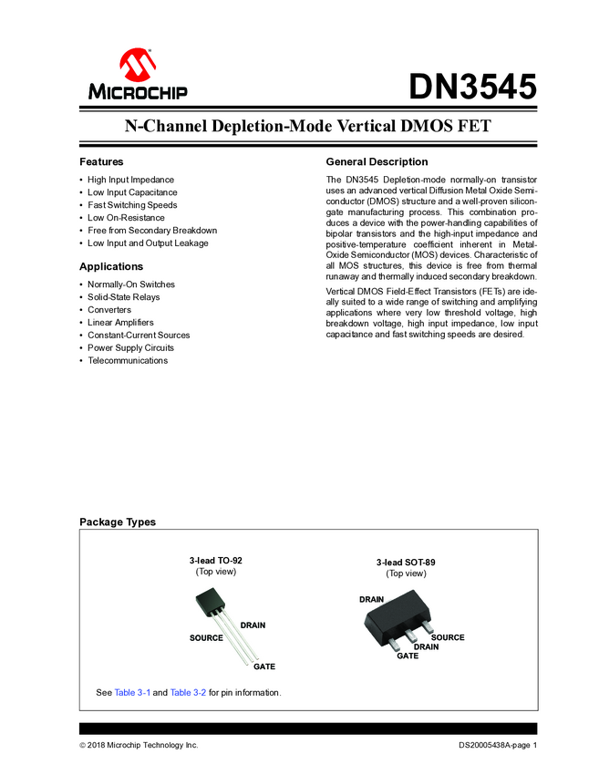 DN3545 N-Channel Depletion-Mode Vertical DMOS FET Data Sheet