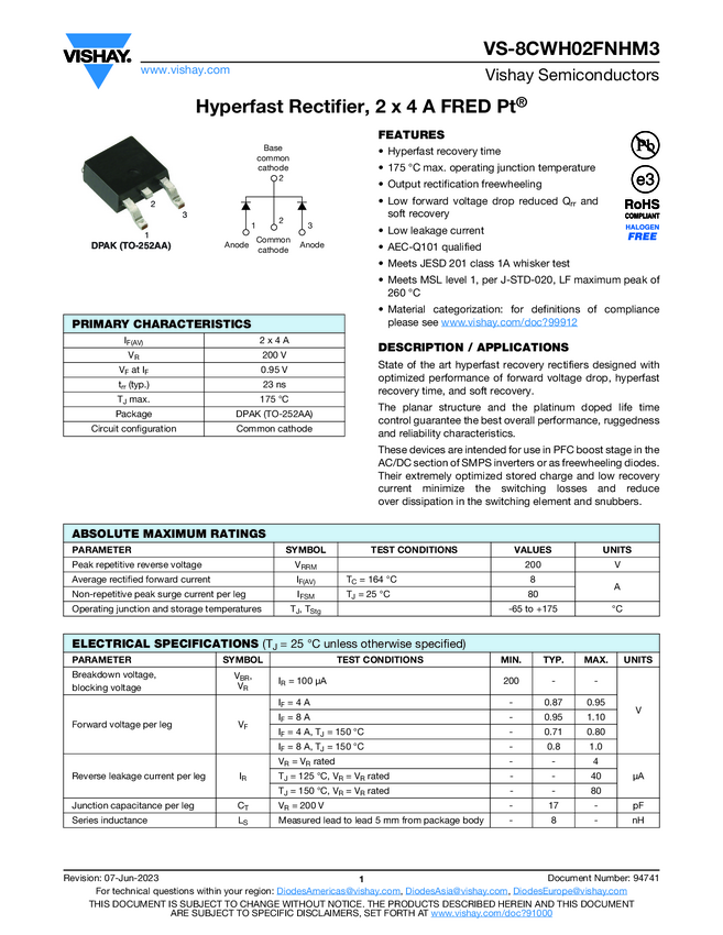 VS-8CWH02FNHM3 Hyperfast Rectifier, 2 x 4 A FRED Pt®