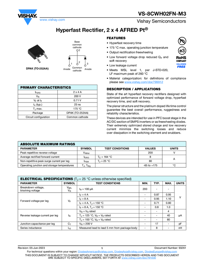 VS-8CWH02FN-M3 Hyperfast Rectifier, 2 x 4 A FRED Pt®