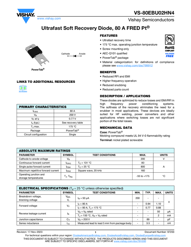 VS-80EBU02HN4 Ultrafast Soft Recovery Diode, 80 A FRED Pt®