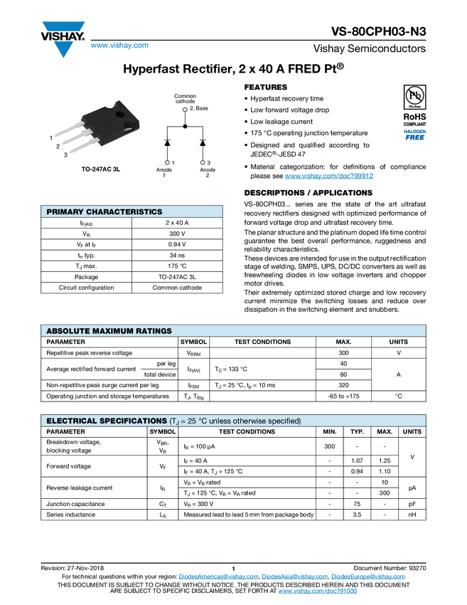 VS-80CPH03-N3 Hyperfast Rectifier, 2 x 40 A FRED Pt®