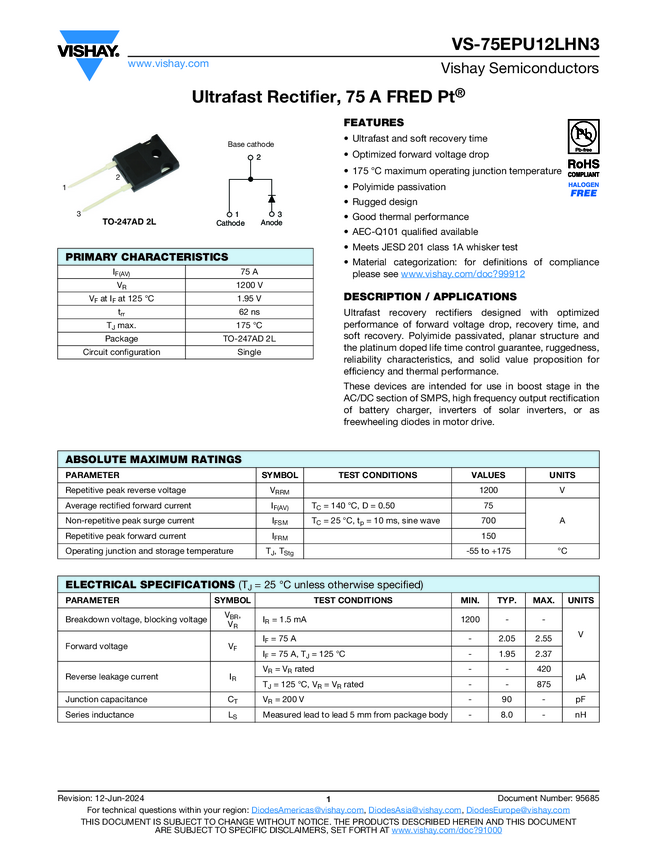 VS-75EPU12LHN3 Ultrafast Rectifier, 75 A FRED Pt®