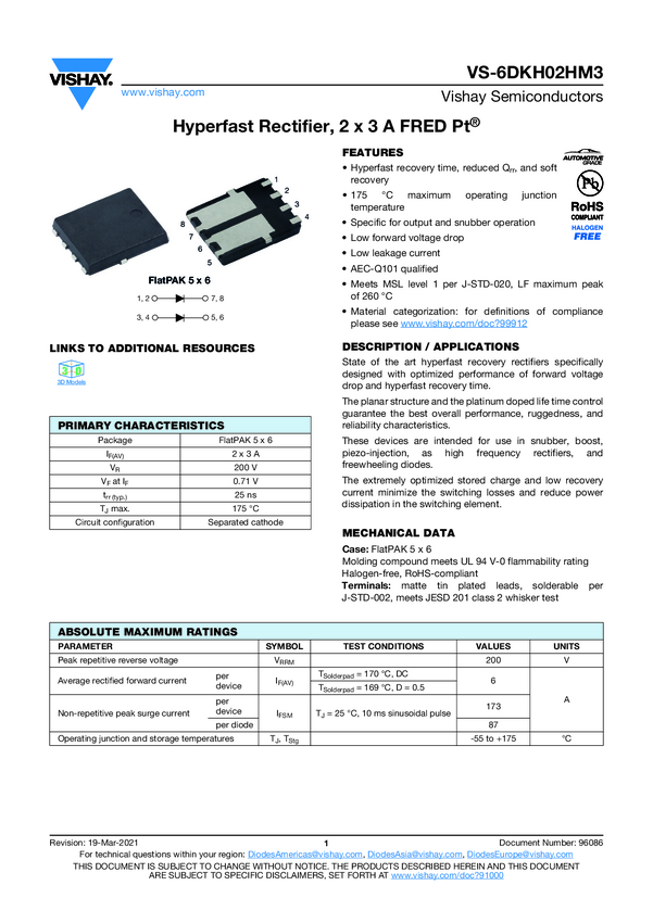 VS-6DKH02HM3 Hyperfast Rectifier, 2 x 3 A FRED Pt®