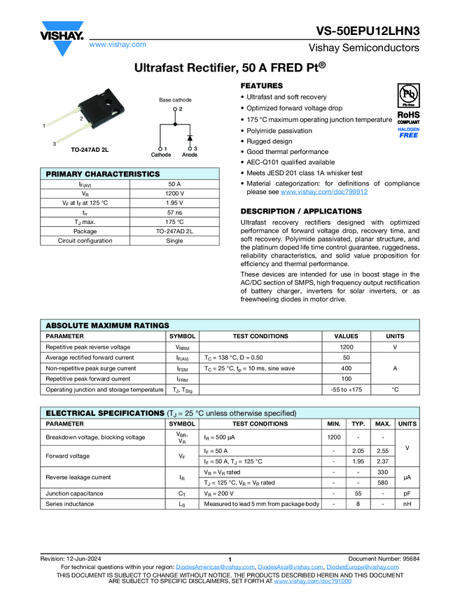 VS-50EPU12LHN3 Ultrafast Soft Recovery Diode, 50 A FRED Pt®