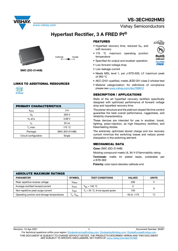 VS-3ECH02HM3 Hyperfast Rectifier, 3 A FRED Pt®