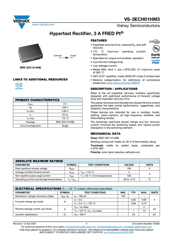 VS-3ECH01HM3 Hyperfast Rectifier, 3 A FRED Pt®