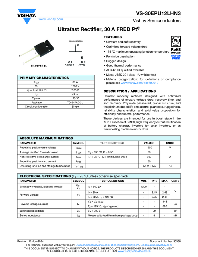 VS-30EPU12LHN3 Ultrafast Soft Recovery Diode, 30 A FRED Pt®