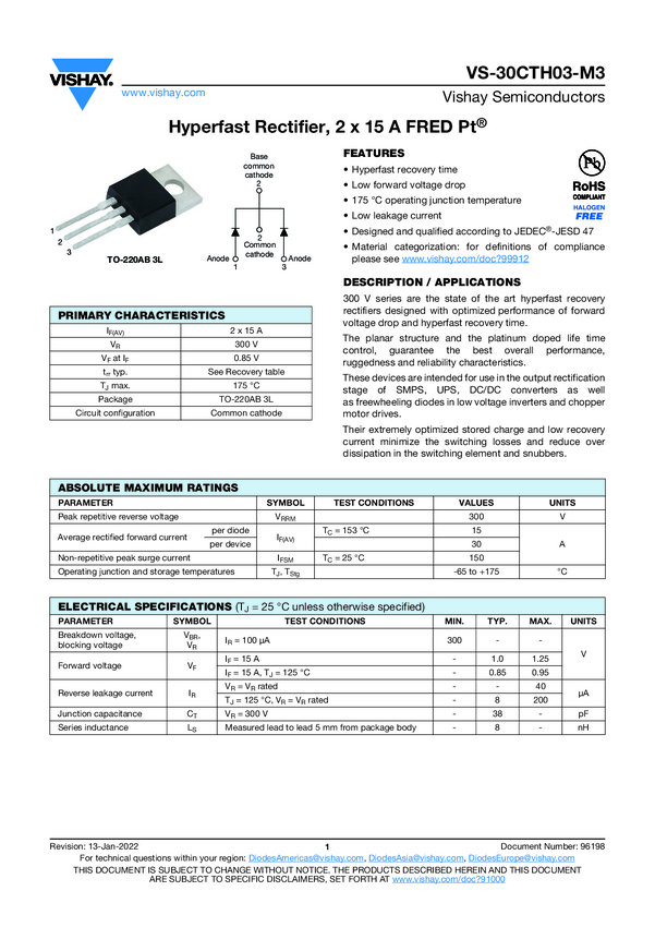 VS-30CTH03-M3 Hyperfast Rectifier, 2 x 15 A FRED Pt®