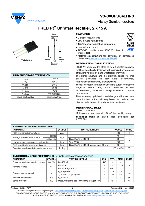 VS-30CPU04LHN3 FRED Pt® Ultrafast Rectifier, 2 x 15 A