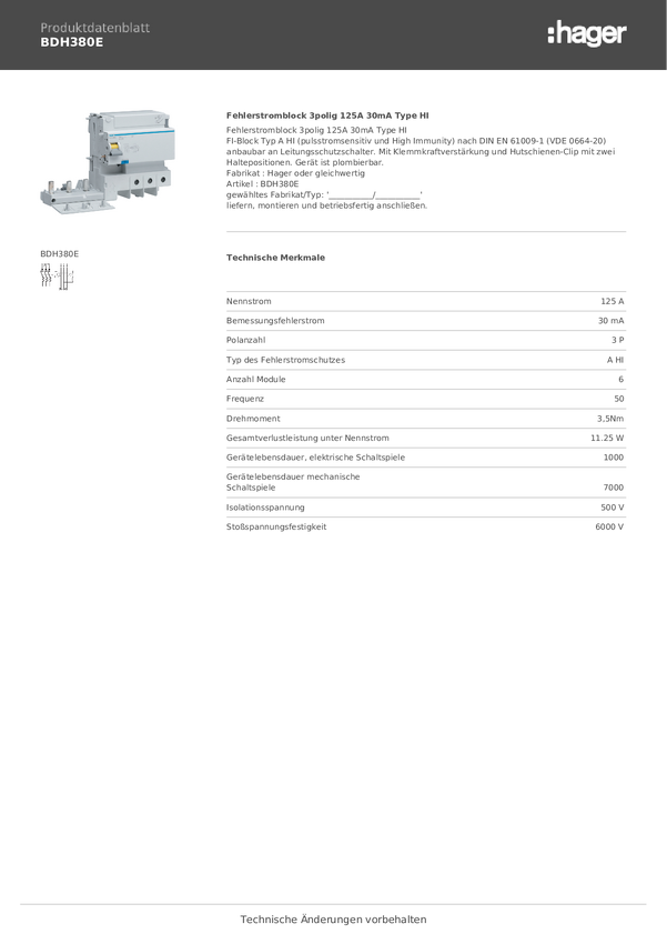 Blok FI Hager BDH380E, 3 styki, 125 A, 230 V