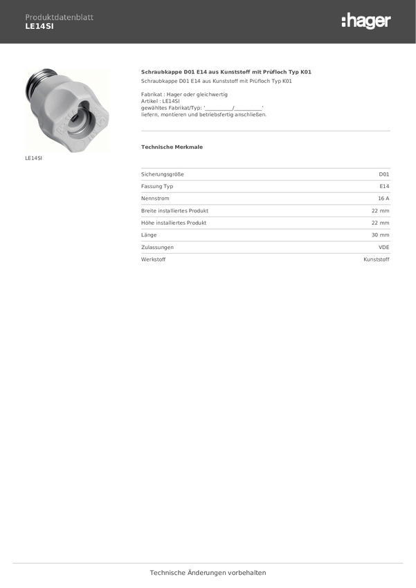 LE14SI Hager LE14SI Nasadka przykręcana Rozmiar bezpiecznika = D01 1 szt.