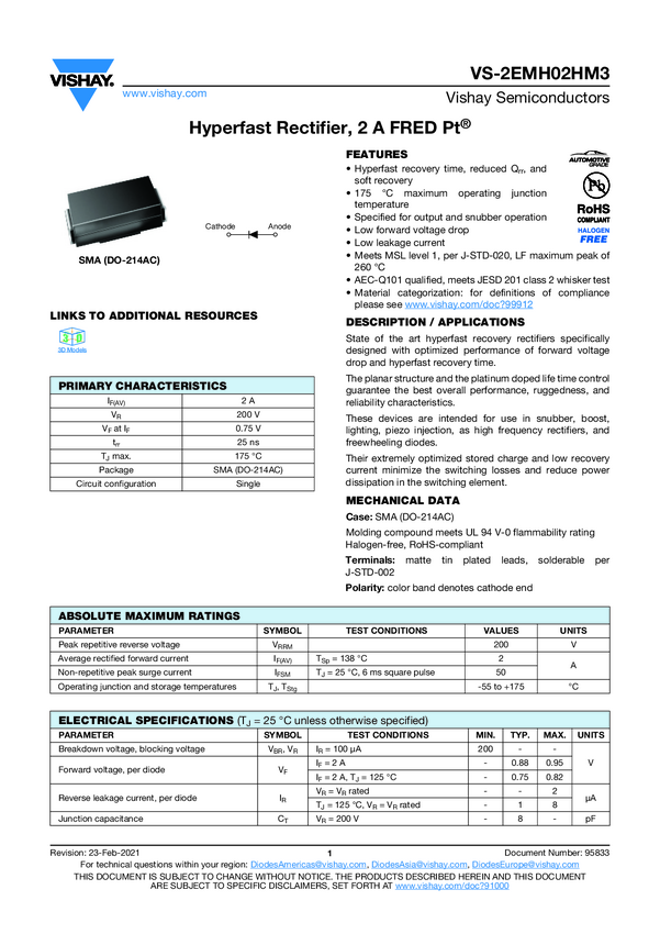 VS-2EMH02HM3 Hyperfast Rectifier, 2 A FRED Pt®