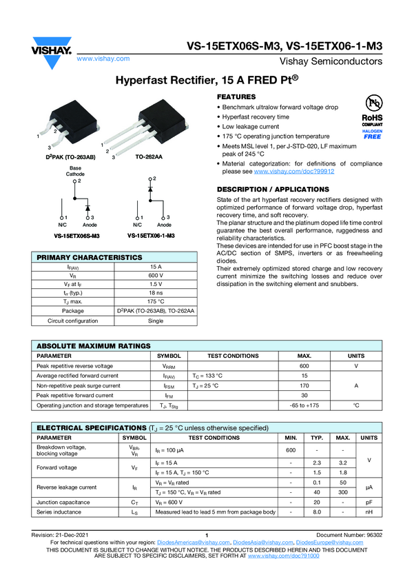 VS-15ETX06S-M3 Hyperfast Rectifier, 15 A FRED Pt®