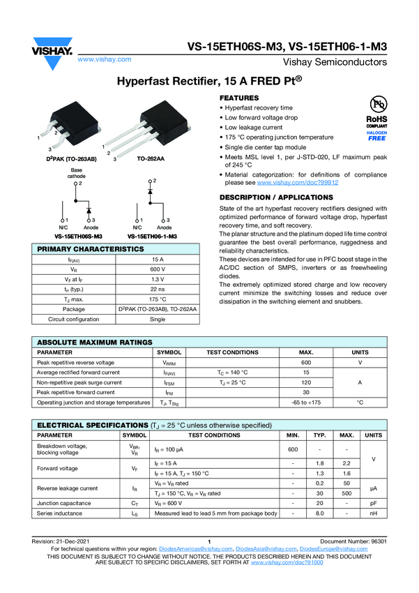 VS-15ETH06S-M3 Hyperfast Rectifier, 15 A FRED Pt®