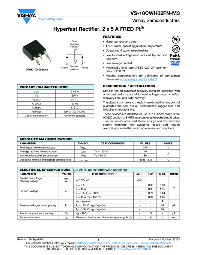 VS-10CWH02FN-M3 Hyperfast Rectifier, 2 x 5 A FRED Pt®