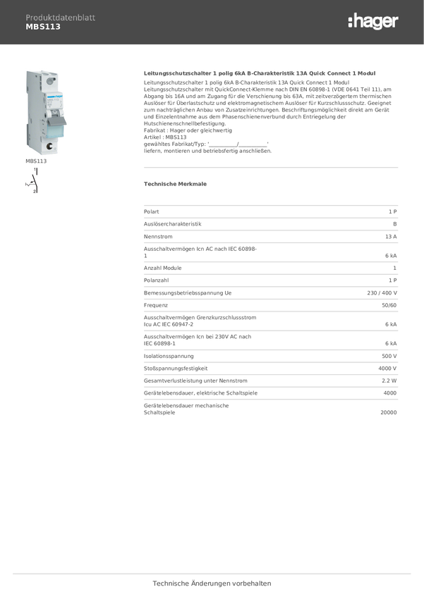 MBS113 Wyłącznik automatyczny Hager MBS113 MBS113, 1 styk, 400 V, 13 A