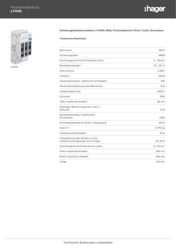 LT058 Hager LT058 Rozłącznik bezpiecznikowy listwowy NH Rozmiar bezpiecznika = 00...