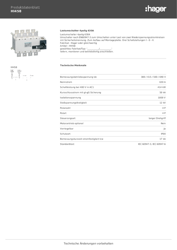 HI458 Hager HI458 Przełącznik zasilania 4 styki 630 A 690 V