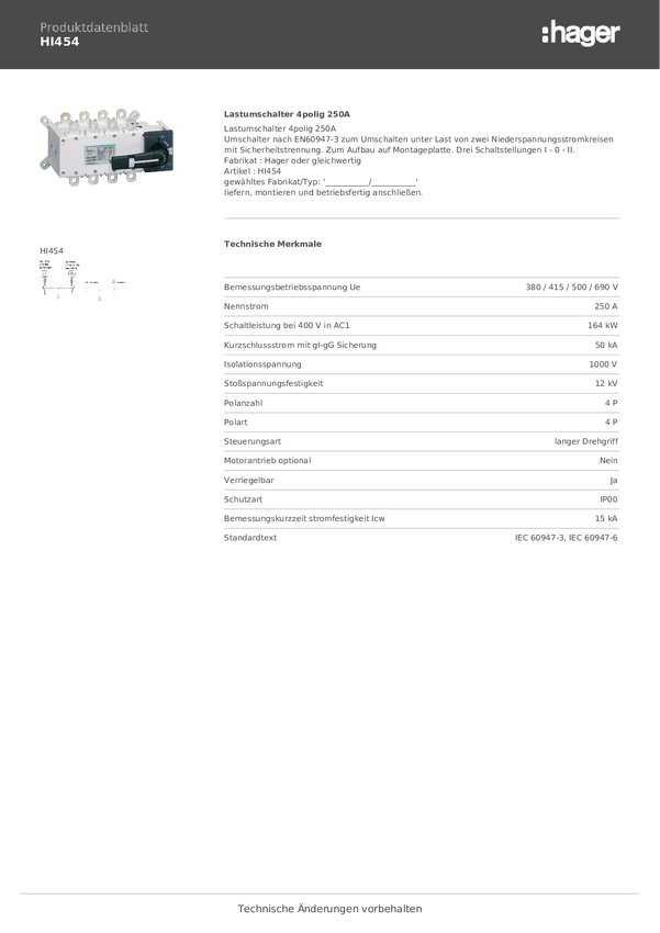 HI454 Hager HI454 Przełącznik zasilania 4 styki 250 A 690 V